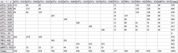 Результаты, полученные в пунктах 7.1 и 7.2 практически одинаковы, а результаты, полученные в пункте 7.3, немного отличаются от остальных . Это зависит от того, что приходится определять визуально по графику коэффициент тяготения, который оказывает влияние на расчёты, а следовательно и на результат вычислений. Однако, из рассмотренных вариантов расчета интенсивности нагрузки наиболее точным является последний, т.к. этот метод учитывает, что интенсивность нагрузки между территориально близкими абонентами выше, чем между теми абонентами, которые территориально отдалены. 8. Структурные матрицы распределения нагрузок На телефонных сетях имеют место разделение и объединение потоков нагрузки. При рассмотрении этих явлений пользуются понятиями исходящей и входящей нагрузок. Структурные матрицы распределения нагрузок строятся в соответствии с расчетами, произведенными в предыдущем пункте с помощью трех методов. По этим матрицам можно рассмотреть полную картину распределения нагрузок, которая учитывает внутристанционную нагрузку, нагрузку от АТСi к АТСj и от АТСj к АТСi, нагрузку от АТС к УСС, УВС, АМТС и наоборот, а также направление межстанционной связи. Каждому методу расчета соответствует своя матрица. 8.1 Пропорционально исходящим нагрузкам Таблица 8.1 Структурная матрица нагрузок пропорционально исходящим нагрузкам