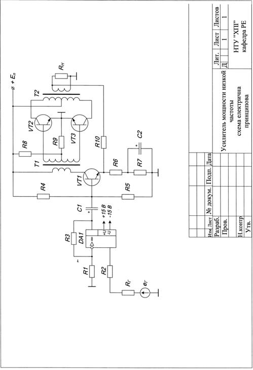 следовательно Источники информации 1. Методические указания к курсовому проекте «Расчёт усилителя мощности низкой частоты». Гуртовая Е.П. – Харьков: НТУ “ХПИ”, 2007. – 41 с. 2. Конспект лекций по курсу «Основы радиоэлектроники». 3. Транзисторы для аппаратуры широкого применения: Справочник. Под ред. Б.Л. Перельмана – М.: Радио и Связь, 1981 – 656 с. Приложение Схема усилителя принципиальная