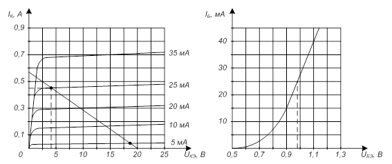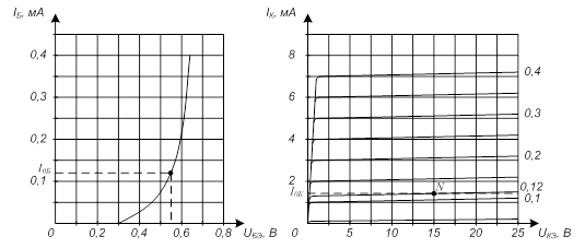 Рисунок 6 – Входная и выходная характеристики транзистора КТ315В Сопротивление нагрузки по переменному току для фазоинверсного каскада:
