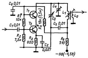 Рис. 5 Схема входной цепи с внешнеемкостной связью с антенной и внутриемкостной связью с транзистором. Для настройки контура входной цепи используем секцию блока конденсаторов. Вычисляем максимально допустимую емкость входной цепи: