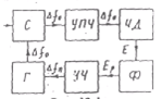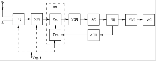Рис. 1 В схему входят следующие функциональные блоки: ВЦ - входная цепь, на которую принимаемый сигнал поступает от внешней или внутренней антенны; УРЧ - усилитель радиочастоты; ПЧ - преобразователь частоты, в состав которого входят смеситель (см) и гетеродин (гет) и в котором происходит преобразование принимаемой частоты сигнала в постоянную промежуточную частоту; радиоприемное устройство диапазон контур УПЧ - усилитель промежуточной частоты, осуществляющий основное усиление сигнала; ЧД - частотный детектор, перед которым включается амплитудный ограничитель (АО); УЗЧ - усилитель звуковой частоты; АПЧ - система автоподстройки частоты. АС - акустическая система на выходе приёмника, в качестве которой может быть громкоговоритель. Совокупность функциональных блоков, от антенны включая детектор, образуя так называемый линейный тракт приемника (ЛТП), и предметом проектирования является проектирование линейного тракта. 1.2 Расчёт полосы пропускания приёмникаПолоса пропускания всего высокочастотного тракта приёмника Пвч от антенны до детектора должна быть больше ширины спектра сигнала из-за возможных отклонений частот и погрешностей сопряжения контуров сигнала и гетеродина, т.е. Пвч>Пс. При проектировании радиовещательных приемников надо учесть, что рабочие частоты радиовещательных станций имеют очень высокую стабильность, и поэтому отклонения частоты принимаемого сигнала можно не рассматривать и не учитывать. Наилучшее качество приёма наблюдается при точной настройке приёмника на принимаемую станцию, а именно при совпадении преобразованной в промежуточную частоты сигнала с центральной частотой полосы пропускания тракта промежуточной частоты (ТПЧ). При этом расчёте следует учесть возможные отклонения частоты гетеродина, т.е. взять 2∆fг. Таким образом, найдём: П = Пс+ 2∆fг (1) В случае в ЧМ сигналов полоса частот Пс, занимаемая спектром сигнала, равна