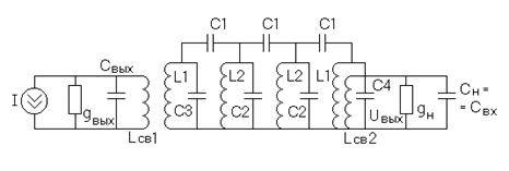 Тогда для выполнения условия (6) Qэ принимаю равным Qэ = 35. 1.4 Выбор и расчет селективных систем тракта промежуточной частотыЦелью данного раздела проектирования является определение типа и числа резонансных систем тракта промежуточной частоты (ТПЧ). И для того, чтобы это обеспечить применяют фильтры сосредоточенной селекции (ФСС), называемые также фильтрами сосредоточенной избирательности (ФСИ). Расчет ТПЧ начнем с ФСС. 1.4.1 Выбор и расчет ФССВ приемниках разных групп сложности, имеющих как средние, так и высокие качественные показатели, применяются многозвенные ФСС на LC-элементах. Схема включения такого многоконтурного фильтра приведена на рисунке 2.