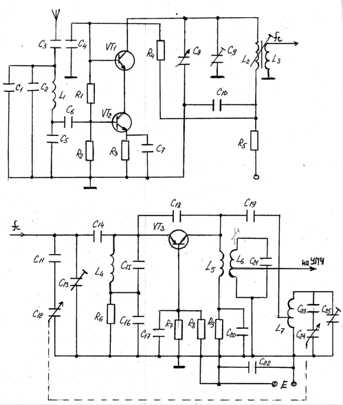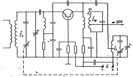 Рисунок 7. Схема транзисторного преобразователя частоты с совмещенным гетеродином диапазона УКВ (прототип УКВ-2-2Е) 6. Автоматическая подстройка частоты Реальная, электрическая схема цепи AПЧ (без ЧД). соответствующая ее структуре на рис8, представлена на рис.9. откуда видно, что в качестве ее управителя частотой (УЧ) используется подключенный к одноконтурной резонансной цепи гетеродина варикап В. К нему всегда приложено постоянное запирающее напряжение Еро, значение которого значительно превышает максимально возможное значение амплитуда действующего на нем сигнала в связи с чем его можно рассматривать только в качестве конденсатора переменной емкости Св, однозначно обусловленной величиной подводимого к нему регулирующего напряжения Ер.