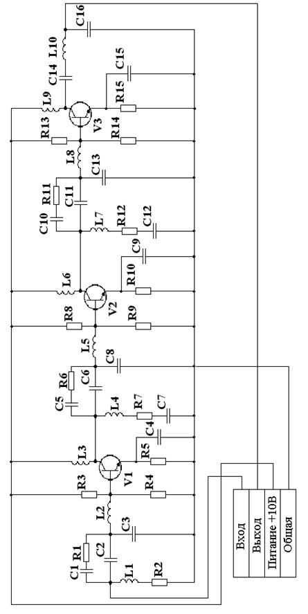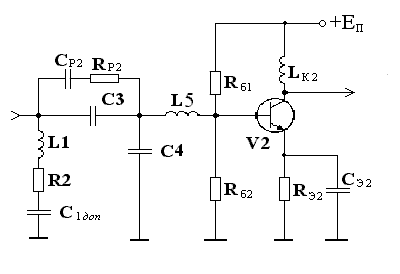 Рисунок 2.10 - Каскад с межкаскадной корректирующей цепью четвёртого порядка. По заданию необходимо осуществить подъём АЧХ на 5 дБ. Так как неравномерность АЧХ всего устройства составляет ±1,5дБ, а число каскадов равно трём, то на каждый каскад приходится неравномерность АЧХ=±0,5дБ. Нормированные значения элементов корректирующей цепи взяты из таблицы 9.1, исходя из заданных частотных искажений [5].