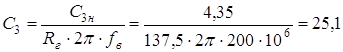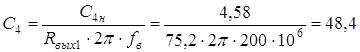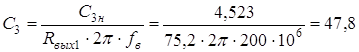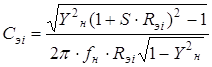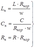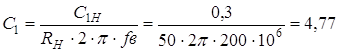 где Rнор и wнор – сопротивление и частота, относительно которых производится нормировка, L, C, R – значения нормируемых элементов Lн, Cн, Rн – нормированные значения. Нормируем Свых (относительно Rн и wв) в соответствии с (2.31) СвыхН=Свых×Rн×wв=5,1×10-12×50×2p×200×106=0,32 В таблице 7.1 [4] находим нормированные значения L1 и С1, соответствующие найденному СвыхН. Ближайшее значение СвыхН=0,285, ему соответствуют: С1Н=0,3 L1Н=0,547 n=1,002. Денормирование элементов производится по следующим формулам: