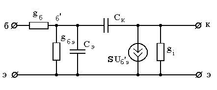 Рисунок 2.5 - Эквивалентная схема Джиаколетто 2). Однонаправленная модель [3] Lвх=Lэ+Lб=0,2+1=1,2 нГн Rвх=rб=1,07 Ом Rвых=Ri=gi –1=75,2 Свых=Ск=5,1 пФ G12ном=(fmax/fтек)2=(3060/200)2=15,32=234,09