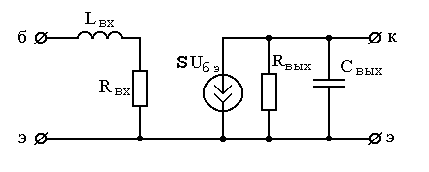 Т.о. элементы однонаправленной модели: Lвх=1,05 нГн Rвх=1,5 Ом Rвых=137,5 Ом Свых=20 пФ Однонаправленная модель приведена на рисунке 3.6. 2.6.3. Эмиттерная термостабилизация Возьмём напряжение на эмиттере равным Uэ=3 В. В соответствии с формулой (2.16), мощность, рассеиваемая на Rэ равна PRэ=2,7× По формулам (2.18)-(2.22) рассчитаем Rэ, Rб1, Rб2: