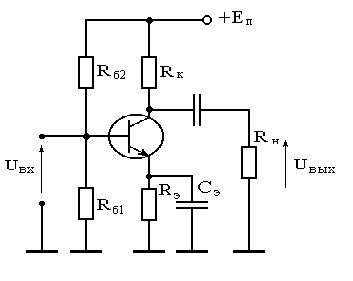 Рисунок 2.7 - Схема оконечного каскада с эмиттерной термостабилизацией Найдём необходимое Еп для данной схемы: Еп=URэ+ Uкэ0+ URк=3+7+0=10 В. (2.17) Рассчитаем Rэ, Rб1, Rб2: