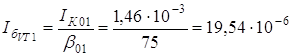 Первый транзистор выбирается исходя из условия, что статический коэффициент передачи тока базы b01=50¸100. Примем b01=75. Ток базы второго транзистора находится по формуле (2.19):