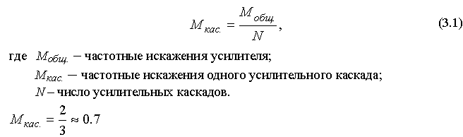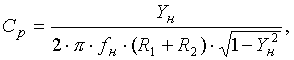 (7.1) где Yн – искажения приходящиеся на каждый конденсатор; R1 – выходное сопротивление транзистора; R2 – сопротивление нагрузки; В нашем случае число разделительных конденсаторов будет равно четырем. Расчитаем разделительные конденсаторы С1 , С6 , С11 , С16 , которые изображены на принципиальной схеме (см. Приложение А). Искажения, приходящиеся на каждый конденсатор, будут равны: