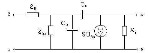 Рисунок 4.5 – Схема Джиаколетто Достоинство этой схемы заключается в следующем: схема Джиаколетто с достаточной для практических расчетов точностью отражает реальные свойства транзисторов на частотах f £ 0.5fт ; при последовательном применении этой схемы и найденных с ее помощью Y- параметров транзистора достигается наибольшее единство теории ламповых и транзисторных усилителей. Расчитаем элементы схемы, воспользовавшись справочными данными и приведенными ниже формулами.