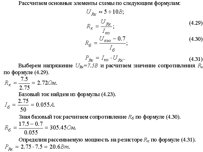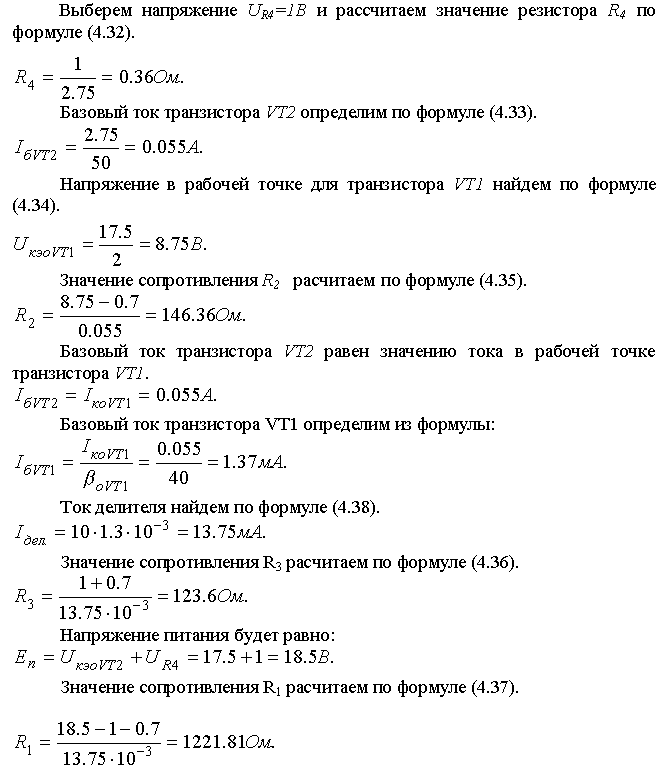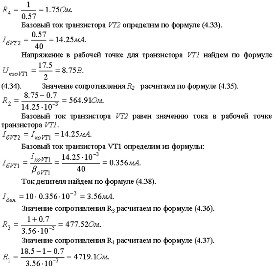5.3 Расчет схемы термостабилизации В предоконечном каскаде используется схема активной коллекторной термостабилизации. Рассчитаем элементы схемы воспользовавшись формулами приведенными в пункте 4.4.3 и рисунком 4.9. Выберем напряжение UR4=1В и расчитаем значение резистора R4 по формуле (4.32).