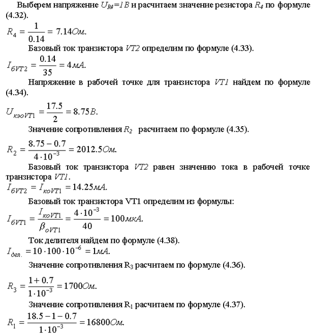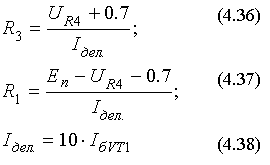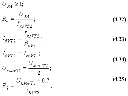 Рисунок 4.9 – Схема активной коллекторной термостабилизации VT1 – транзистор КТ814: bо= 40, Uкэдоп.=20В, Iк =2.5А; VT2 – транзистор КТ930Б. Рассчитаем элементы схемы по следующим формулам: