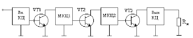 4.5 Расчет корректирующих цепей 4.5.1 Выходная корректирующая цепь Для передачи без потерь сигнала от одного каскада многокаскадного усилителя к другому используется последовательное соединение корректирующих цепей (КЦ) и усилительных элементов [6]. На рисунке 4.10 изображен пример построения такой схемы усилителя по переменному току.