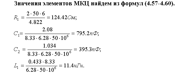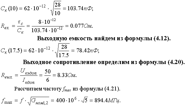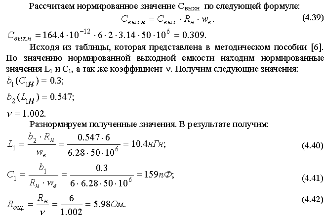 Рассчитаем межкаскадную корректирующую цепь между выходным и предоконечным каскадом. Для этого представим схему приведенную на рисунке 4.12 в виде эквивалентной схемы изображенной на рисунке 4.13. Рассчитаем элементы МКЦ. Значения выходных параметров транзистора КТ930А возьмем из пункта 5.2, где рассчитана эквивалентная схема этого транзистора. КТ930А: Cвых.= 78.42 пФ;. Rвых.= 8.33 Ом.
