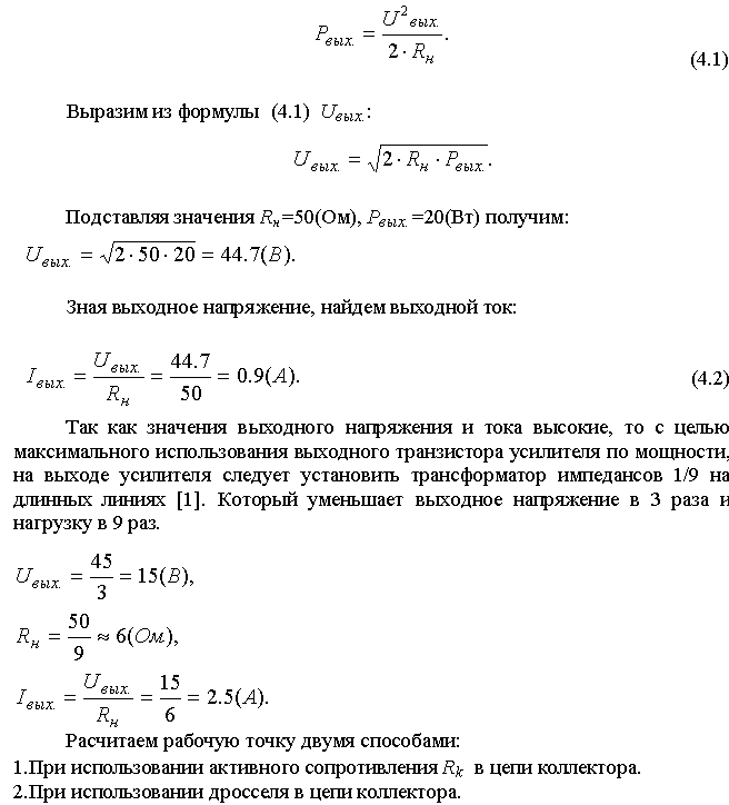 4 Расчет оконечного каскада 4.1 Расчет рабочей точки Для расчета рабочей точки найдем выходное напряжение, которое должен выдавать усилитель, воспользовавшись следующим соотношением: