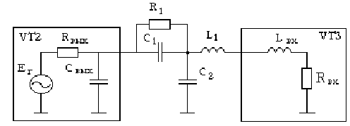 4.5.2 Межкаскадная корректирующая цепь Как упоминалось ранее, для передачи сигнала от одного каскада многокаскадного усилителя к другому, от источника сигнала на вход первого усилительного элемента и от выходной цепи последнего усилительного элемента в нагрузку применяют различные схемы, называемые межкаскадными корректирующими цепями (МКЦ). Эти схемы одновременно служат и для подачи питающих напряжений на электроды усилительных элементов, а также придания усилителю определенных свойств. Существуем множество различных схем МКЦ, но в данном курсовом проекте используется межкаскадная корректирующая цепь третьего порядка, которая изображена на рисунке 4.12. Межкаскадная корректирующая цепь третьего порядка обеспечивает достаточно хорошее согласование между усилительными элементами и способствует максимальной отдачи выходной мощности усилительного элемента в нагрузку.