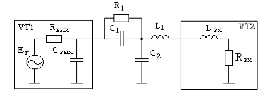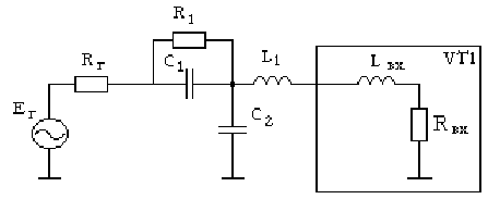 Рисунок 4.11 – Схема выходной корректирующей цепи Выходную корректирующую цепь можно рассчитать с использованием методики Фано, которая подробно описана в методическом пособии [6]. Зная Свых и fв можно рассчитать элементы L1 и C1 .