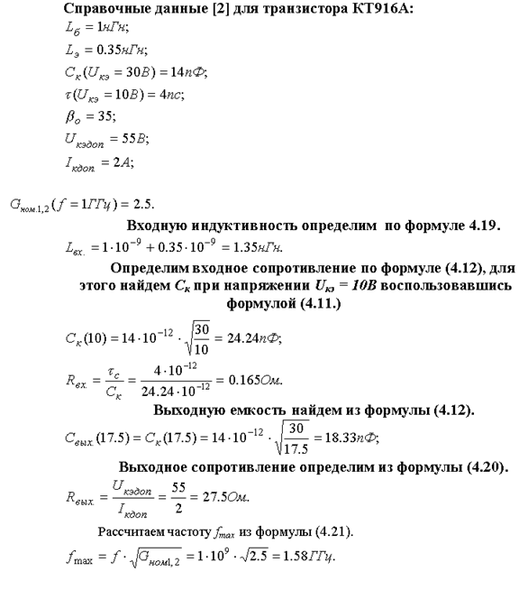 5.2 Расчет эквивалентной схемы транзистора В качестве эквивалентной схемы расчитаем однонаправленную модель транзистора. Рассчитаем элементы схемы, воспользовавшись справочными данными и формулами приведенными в пункте 4.3.2.