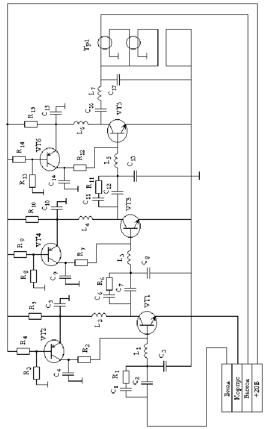 8 Заключение В результате работы был рассчитан усилитель, который имеет следующие параметры: 1.Рабочая полоса частот 0.5 – 50МГц. 2.Допустимые частотные искажения 2дБ. 3.Коэффициент усиления 44дБ. 4.Питание Еп =20В. 5.Выходная мощность Рвых.=20Вт. Усилитель имеет запас по усилению 14дБ, это необходимо для того, чтобы в случае ухудшения параметров отдельных элементов коэффициент передачи усилителя не опускался ниже заданного уровня. Список использованных источников 1 Проектирование радиопередающих устройств./ Под ред. О.В. Алексеева. – М.: Радио и связь, 1987.- 392с. 2 Полупроводниковые приборы: транзисторы. Справочник / Под ред. Горюнов Н.Н. – 2-е изд. М.: Энергоатомиздат, 1985-903с. 3 Горбань Б.Г. Широкополосные усилители на транзисторах. – М.: Энергия, 1975.-248с. 4 Титов А.А., Бабан Л.И., Черкашин М.В. Расчет межкаскадной согласующей цепи транзисторного полосового усилителя мощности // Электронная техника СЕР, СВЧ – техника. – 2000. – вып. 1(475). 5 Цыкин Г.С. Усилительные устройства.-М.: Связь, 1971.-367с. 6 Титов А.А. Расчет корректирующих цепей широкополосных усилительных каскадов на биполярных транзисторах, http://referat.ru/download/ref-2764.zip. 7 Красько А.С. Проектирование аналоговых электронных устройств. - Томск: ТУСУР, 2000.-29с. Приложение А Принципиальная схема представлена на стр. 41. Перечень элементов приведен на стр. 42,43.