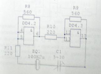 Окончание проверки определяется моментом появления сигнала переноса с выхода старшего разряда СЧЦ. Этот сигнал сбрасывает ТгРР в ноль, тем самым запрещает прохождение тактовых сигналов на ГПСП и СЧЦ и формирует сигнал «Годен». Если в процессе контроля произошло несовпадение откликов с контролируемого и эталонного ТЭЗов, то на выходе СС формируется сигнал «Брак» который сбрасывает ТгРР в ноль, тем самым останавливая проверку. Для продолжения контроля используется асинхронный сигнал «Продолжить», поступающий с пульта оператора. Этим сигналом ТгРР переводится в единичное состояние. Так как сигналы «Пуск» и «Продолжить» являются асинхронными, то они должны подаваться на ТгРР через схемы устранения дребезга контактов По рассчитанным параметрам построим временную диаграмму функционирования стенда. 10. Разработка электрических схем блоков и расчет их электрических параметров Разработку электрических схем блоков начнем с выбора элементной базы, на основе которой они будут строиться. Генератор тактовых импульсов выполним по схеме кварцевого автогенератора. Схему построим на двух логических элементах К155ЛА которые введены в линейный усилительный режим с помощью резисторов отрицательной обратной связи R=560 Ом. А положительная обратная связь необходимая для генерации колебаний создается при помощи кварца ZQ1 частотой 100 КГц. Изменением величины подстроенного конденсатора С1 добиваемся наиболее устойчивой работы автогенератора