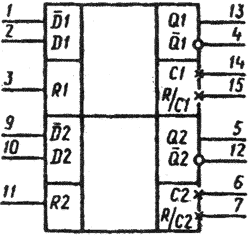 Графическое обозначение К155АГЗ Назначение выводов: 1-вход информационный D/1; 2 – вход D1; 3-вход «установка нуля» R1; 4-выход Q/1; 5-выход Q2; 6-выход «емкость внешняя» Свн2; 7-выход Рвн/Свн2. 8-общий, 9-вход D2; 10-вход D2; 11-вход «установка нуля» R2; 12-выход Q/2; 13-выход Q1; 14-выход Свн1; 15 – выход Rвн1/Свн1; 16 – напряжение питания. Электрические параметры Номинальное напряжение питания……………….5 В ± 5% Выходное напряжение низкого уровня…………. =< 0,4 В Выходное напряжение высокого уровня………..> 2,4 В Входной ток низкого уровня: по информационным входам 1, 2, 9, 10…………. =< -1,6 мА по входам установки нуля 3/11……………………… =< – 3,2 мА Входной ток высокого уровня: по информационным входам 1, 2, 9, 10…………..=< 0,04 мА по входам установки нуля 3, 11……………………… =< 0,08 мА Входной пробивной ток………………………………. =< 1 мА Ток короткого замыкания……………………………. -10…-40мА Ток потребления…………………………………………. =< 66 мА Потребляемая мощность………………………………. =< 346,5 мВт Время задержки распространения при включении: по информационным входам 1, 9……………………=< 40 нс по входам 2, 10……………………………………………..=< 36 нс по входам установки нуля 3, 11……………………. =< 27 нс Время задержки распространения при выключении: по информационным входам 1, 9……………………=<33 нс по входам 2, 10……………………………………………..=< 28 нс по входам установки нуля 3, 11………………………=< 40 нс Минимальная длительность импульса на выходе (Свн =0)……………………….=< 65 нс Длительность импульса на выходе (Свн = 1000 пФ)………………………………. 2,76. 3,37 мкс Емкость нагрузки……………………………………………=< 200 пФ 9. Расчет параметров временной диаграммы функционирования стенда Автоматический стенд инициируется внешним сигналом «Пуск», Поступающим с пульта оператора. Этим сигналом ГПСП, СЧЦ и триггер разрешения работы (ТгРР) устанавливаются в исходное состояние. Сигнал с выхода ТгРР разрешает прохождение тактовых сигналов на ГПСП. СЧЦ и ГСИ. которые срабатывают по положительному фронту тактового импульса. По положительному фронту стробирующего импульса «Строб 1» состояние ГПСП и СЧЦ определяется максимальным временем задержек от тактовых входов до выходов в этих блоках. Импульс «Строб 2» предназначен для записи откликов с контролируемого и эталонного ТЭЗов в РГВ. Причем, к этому моменту все переходные процессы в ТЭЗах должны закончиться. Последнее диктует выбор времени t2 с 1,5–2 кратным запасом по отношению к максимальной задержке распространения сигнала в ТЭЗе. т.е.