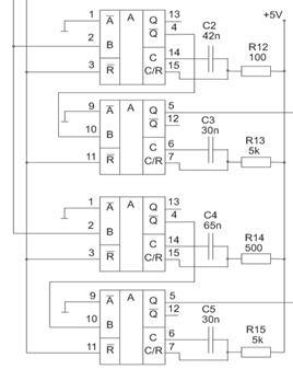 Так как эта частота весьма большая для схемы динамической индикации в схеме уменьшим частоту в 10 раз до 100 КГц. При этом полное время проверки ТЭЗа будет составлять менее секунды. 11. Генератор стробируюших импульсов (ГСИ) ГСИ генерирует ряд строб импульсов, через заданные промежутки времени, чтобы обеспечить считывание входных значений блоков РГВ, ФВВ, СС после завершения переходных процессов в этих блоках и формирования правильных значений на выходах этих блоков. ГСИ выполнен на нескольких мультивибраторах-автогенераторах К155АГЗ. Микросхема К155АГЗ – ждущий мультивибратор с возможностью перезапуска. Он имеет выходы Q и Q, вход сброса R (активный уровень низкий) и два входа запуска В-прямой с активным высоким уровнем и А – инверсный с активным низким уровнем. К выводам мультивибратора подключены времязадающие элементы R и С. Мультивибратор АГЗ сбрасывает по положительному фронту входного импульса, потом выжидает паузу Т, затем формирует импульс длительностью Т. Длительность Т определяется параметрами К-С цепи первого мультивибратора в микросхеме, длительность Т определяется параметрами второй К-С цепи.