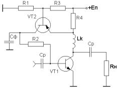 Рисунок 4.4.3 В данной схеме транзистор VT2 используется в качестве элемента термостабилизации. Ток коллектора VT2 является базовым током смещения. Здесь примем где где где Так как нужно реализовать усилитель с подъемом АЧХ, то необходимо применение диссипативной межкаскадной корректирующей цепи четвёртого порядка [1]. Принципиальная схема усилителя с межкаскадной корректирующей цепью четвертого порядка приведена на рисунке 4.5.1,а, эквивалентная схема по переменному току - на рисунке 4.5.1,б.