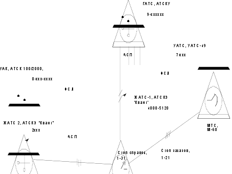 На функциональной схеме связи железнодорожного узла показаны проектируемая АТС и встречные станции. Схема выполнена так, что можно проследить установление соединения как внутри проектируемой станции, так и с абонентами встречных станций. Станции узла соединяются между собой по физическим соединительным линиям (ФСЛ), каналам ТЧ систем передачи – аналоговым (АСП) . Включение линий и каналов производится посредством комплектов соединительных линий (КСЛ) – исходящих (ИК), входящих (ВК), двухсторонних (ДК). Тип КСЛ зависит от способа организации СЛ или канала ТЧ. Имеются следующие типы КСЛ: ИКБ-3, ВКБ-3 – исходящий и входящий комплекты для работы по трехпроводным физическим соединительным линиям; ДКБК – двухсторонний комплект для работы по каналам ТЧ без выделенного сигнального канала; сигнализация частотой 2600 или 2100 Гц, используемая на сети АКТС железнодорожного транспорта; Перечисленные комплекты обеспечивают трансляцию импульсов набора номера как декадным, так и многочастотным кодом. Для связи со спецслужбами и ручной МТС служат комплекты: ИКС – исходящий комплект для связи со спецслужбами (столом справок и столом заказов МТС); ВКМР – входящий комплект для связи от МТС. На встречных станциях узла для включения соединительных линий и каналов применяются комплекты, входящие в состав оборудования этих АТС. Функциональная схема узла связи показана на рис.1.2. Проектируемая ЖАТС 1 типа АТСКЭ "Квант" емкостью 1120 номеров построена по узловой схеме. Станция обслуживает абонентов управления железной дороги, имеющих нумерацию 4000 - 5120. Связь с ГАТС типа АТСКУ осуществляется по аналоговой системе передачи К-12+12, для чего на ЖАТС 1 применяются комплекты ДКБК, на ГАТС – комплекты СЦТ. Взаимодействие между станциями осуществляется многочастотным кодом. Для выхода на ГАТС от абонентов ЖАТС 1 используется индекс 9 и набор шестизначного номера городского абонента. Для соединения с абонентом ЖАТС 1 абонент ГАТС должен набрать шестизначный номер 2994XXX или 2995XXX, по каналу АСП транслируются последние четыре цифры. Связь ЖАТС 1 с УАТС типа ДШС осуществляется по физическим соединительным линиям (ФСЛ), для этого на проектируемом "Кванте" используются комплекты ИКБ-3 и ВКБ-3, на КРЖ – комплекты СК. Взаимодействие осуществляется декадными импульсами. Выход от ЖАТС 1 на УАТС осуществляется набором индекса 7 и трехзначного номера абонента ДШС, выход от УАТС на ЖАТС 1 – набором индекса 0 и, после получения от "Кванта" повторного ОС, набором четырехзначного номера абонента. Связь с УАКом координатной системы организована по физическим соединительным линиям с помощью комплектов ИКБ-3 и ВКБ-3 со стороны "Кванта" и РСЛИ-4 и ПКУ со стороны УАКа. Взаимодействие между ЖАТС-1 и УАКом осуществляется декадно-батарейными импульсами. Для выхода на УАК абонент "Кванта" набирает 0 и далее 7 цифр (3 цифры кода города и 4 цифры номера абонента), которые транслируются по соединительной линии. При входящем соединении от УАК поступают 4 цифры номера. Проектируемая АТС имеет исходящую связь со спецслужбами (столом справок и столом заказов) по физическим линиям через комплекты ИКС. Выход осуществляется кодами 131 и 121 соответственно. Входящая связь от МТС осуществляется по физическим линиям через комплекты ВКМР. При занятии комплекта телефонистке подается ОС. Номер транслируется дек