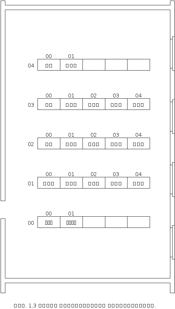 Оборудование АТСКЭ “Квант” размещается параллельными рядами перпендикулярно стене с окнами. Расстояния между рядами оборудования и между оборудованием и стенами помещения выбираются из условия удобства обслуживания и правил техники безопасности. Перекрытия автоматного зала должны выдерживать нагрузку 450 кг/м2. На станции может быть от одного до шести стативных рядов. 3.2. Комплектация оборудования ЦУУ. Станции любой емкости и назначения имеют в своем составе статив центрального управляющего устройства ЦУУ, который обычно расположен в ряду 00 на стативном месте 00. Комплектация статива ЦУУ показана на рис. 3.1. Статив ЦУУ укомплектован следующими блоками: