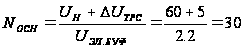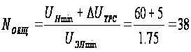 где UНmin – минимально допустимое напряжение на зажимах нагрузки; DUТРС – допустимое падение напряжения в токораспределительной сети и устройствах коммутации; UЭлmin – минимально допустимое напряжение на одном элементе батареи (UЭлmin=1.75). Число основных элементов рассчитывается по формуле