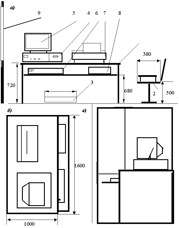 Рисунок 2.1 - Схема рабочего места программиста: а ) вид спереди ; б) вид с верху ; в) вид с боку. 4. Пожаробезопасность. Степень огнестойкости зданий принимается в зависимости от их назначения, категории по взрывопожарной и пожарной опасности, этажности, площади этажа в пределах пожарного отсека. Здание, в котором находится лаборатория по пожарной опасности строительных конструкций относится к категории K1 (малопожароопасное), поскольку здесь присутствуют горючие (книги, документы, мебель, оргтехника и т.д.) и трудносгораемые вещества (сейфы, различное оборудование и т.д.), которые при взаимодействии с огнем могут гореть без взрыва. По конструктивным характеристикам здание можно отнести к зданиям с несущими и ограждающими конструкциями из естественных или искусственных каменных материалов, бетона или железобетона, где для перекрытий допускается использование деревянных конструкций, защищенных штукатуркой или трудногорючими листовыми, а также плитными материалами. Следовательно, степень огнестойкости здания можно определить как третью (III). Помещение лаборатории по функциональной пожарной опасности относится к классу Ф 4.2 – высшие учебные заведения, учреждения повышения квалификации. 4.1 Причины возникновения пожара Пожар в лаборатории, может привести к очень неблагоприятным последствиям (потеря ценной информации, порча имущества, гибель людей и т.д.), поэтому необходимо: выявить и устранить все причины возникновения пожара; разработать план мер по ликвидации пожара в здании; план эвакуации людей из здания. Причинами возникновения пожара могут быть: неисправности электропроводки, розеток и выключателей которые могут привести к короткому замыканию или пробою изоляции; использование поврежденных (неисправных) электроприборов; использование в помещении электронагревательных приборов с открытыми нагревательными элементами; возникновение пожара вследствие попадания молнии в здание; возгорание здания вследствие внешних воздействий; неаккуратное обращение с огнем и несоблюдение мер пожарной безопасности. 4.2 Профилактика пожара Пожарная профилактика представляет собой комплекс организационных и технических мероприятий, направленных на обеспечение безопасности людей, на предотвращении пожара, ограничение его распространения, а также создание условий для успешного тушения пожара. Для профилактики пожара чрезвычайно важна правильная оценка пожароопасности здания, определение опасных факторов и обоснование способов и средств пожаропредупреждения и защиты. Одно из условий обеспечения пожаробезопасности - ликвидация возможных источников воспламенения. В лаборатории источниками воспламенения могут быть: · неисправное электрооборудование, неисправности в электропроводке, электрических розетках и выключателях. Для исключения возникновения пожара по этим причинам необходимо вовремя выявлять и устранять неисправности, проводить плановый осмотр и своевременно устранять все неисправности; · неисправные электроприборы. Необходимые меры для исключения пожара включают в себя своевременный ремонт электроприборов, качественное исправление поломок, не использование неисправных электроприборов; · обогревание помещения электронагревательными приборами с открытыми нагревательными элементами. Открытые нагрева