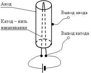 Эффект излучения каких-то частиц или лучей раскаленным электродом, имеющим отрицательный потенциал, был обнаружен всемирно известным изобретателем Т.А.Эдиссоном. Эти лучи назвали катодными и выяснили, что они представляют собой поток отрицательно заряженных частиц – электронов. Коллега Эдиссона Флеминг создал в 1904 году прибор, использующий эффект Эдисона, и назвал его диодом. Диод состоял из раскаленной нити – катода, расположенной внутри металлического цилиндра – анода. Вся эта конструкция помещалась внутрь стеклянного баллона с откачанным воздухом. Принципы работы диода Принцип работы диода был ясен (в отличие от принципа работы полупроводникового диода). Вокруг катода создается электронное облако, плотность которого убывает по мере удаления от него. Если потенциалы катода и анода одинаковы и анод располагается достаточно близко к катоду, то часть электронов попадет на анод, и во внешней цепи (проводнике, соединяющем анод с катодом) будет течь небольшой ток.