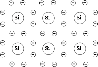 Между катодом и анодом включается источник питания (100 – 200 В), создающий сильное электрическое поле, заставляющее электроны двигаться к аноду. Источник напряжения, включенный между сеткой и катодом (единицы вольт), минусом подключен к сетке и создает тормозящее для электронов поле. Так как сетка расположена вблизи катода, то поле, создаваемое ей, может полностью скомпенсировать ускоряющее для электронов поле, создаваемое анодом. При напряжении на сетке, меньшем напряжения запирания, электроны не могут приблизиться к сетке, анодный ток IА равен нулю, лампа заперта. При увеличении напряжения на сетке преобладающим становится электрическое поле, создаваемое анодом. Электроны будут проходить через сетку и устремляться к аноду. Количество пропускаемых сеткой электронов увеличивается с увеличением потенциала сетки. На саму сетку электроны попасть не могут, так как она отрицательно заряжена и ток в сеточной цепи равен нулю. Важной характеристикой электронной лампы является зависимость анодного тока IА от напряжения на сетке VС и параметр лампы, называемый крутизной S = ΔIA/ΔVС. Для приведенной на рисунке характеристики S ≈ 4,5 мА/В. Коэффициент усиления зависит от величины сопротивления R в анодной цепи, с которого снимается выходное напряжение. Коэффициент усиления равен SR. При сопротивлении R = 10 кОм коэффициент усиления равен 10*4,5 = 45 Транзисторы После триода появились многоэлектродные лампы: тетрод – с двумя сетками, пентод – с тремя сетками, октод – с четырьмя и пентагрид – с пятью сетками. Но в 50-е годы прошлого века начался закат ламповой техники. Появились полупроводниковые усилительные элементы. Они обладали намного меньшими размерами, чего требовала в то время развивающаяся военная техника и ЭВМ. В 1947 г. появился первый точечный биполярный транзистор. Его разработали сотрудники фирмы Bell Telephone Laboratories, физики Вильям Шокли, Джон Бардин и Уолтер Х.Браттейн. В 1956 г они получили Нобелевскую премию по физике за исследования полупроводников и открытие транзисторного эффекта. Сразу вслед за изобретением точечного транзистора Шокли предложил структуру плоскостного транзистора, но он не был в состоянии проверить свою теорию работы этого прибора просто потому, что в то время еще не существовало путей создания плоскостного транзистора. Плоскостной транзистор появился только в начале 50-х годов. Основой транзистора является полупроводниковый материал. Полупроводниками являются химические Элементы углерод, германий и кремний. Вначале в транзисторах использовался Германий, сейчас, в основном, кремний. Атомы и германия и кремния на внешней электронной оболочке содержат по четыре электрона, как показано ниже на рисунке. А должна быть заполнена эта оболочка восемью электронами. Поэтому атомы образуют кристаллическую решетку, в которой каждый атом “отдает в совместное пользование” свои четыре электрона соседним четырем атомам. И таким образом, каждый атом имеет на внешней оболочке по восьми электронам, движущимся по немыслимым орбитам.