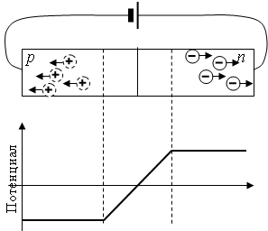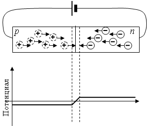 В обедненном слое нарушается электрическая нейтральность полупроводника. В полупроводнике р-типа в обедненном слое не хватает дырок, поэтому он заряжен отрицательно. А в полупроводнике п-типа в обедненном слое не хватает электронов, поэтому он заряжен положительно. Таким образом, в месте соединения полупроводников разного типа возникает потенциальный барьер, который не позволяет основным носителям преодолеть р-п переход. Величина потенциального барьера зависит от полупроводникового материала. Для германия он составляет 0,3 В, а для кремния – 0,7 В. Рассмотрим, что происходит, когда к р-п переходу прикладывается напряжение от внешнего источника.