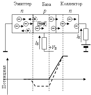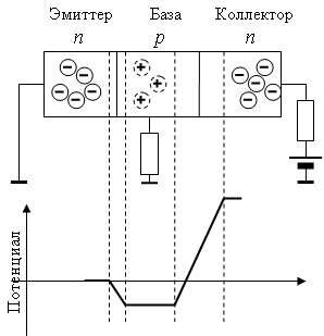 Плоскостной транзистор п-р-п типа Отмеченные свойства р-п перехода лежат в основе работы плоскостных транзисторов. В плоскостном транзисторе п-р-п типа коллектор и эмиттер являются полупроводниками п типа, а база полупроводником р типа. Транзистор содержит два р-п перехода: эмиттер-база и база-коллектор. Если на базу не подается напряжения, то р-п переходы противодействуют перемещению основных носителей из полупрводника одного типа в полупроводник другого типа. Транзистор заперт. На эмиттерном переходе (эмиттер-база) возникает потенциальный барьер (0,7 В для кремния и 0,3 для германия). Коллекторный переход (база-коллектор) смещен в орбратном напрвлении, так как к полупроводнику п типа приложено положительное напряжение относительно полупроводника р типа. Распределение потенциала в окрестности базы для этого случая показано ниже.