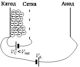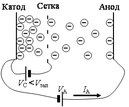 Если между катодом и анодом включить источник напряжения плюсом к аноду, то потенциал анода будет положительным по отношению к катоду. Под воздействием возникшего внутри диода электрического поля электроны будут двигаться к аноду, и во внешней цепи потечет сильный ток. Если изменить полярность источника питания, то есть минус подсоединить к аноду, а плюс – к катоду, то внутри диода возникнет тормозящее электрическое поле, которое будет отталкивать электроны от анода, и ток во внешней цепи будет равен нулю. Зависимость тока I, протекающего через диод, от напряжения V, приложенного к диоду называется вольтамперной характеристикой диода. Если приложенное напряжение меньше напряжения запирания Vзап, диод заперт, ток через него не течет. Когда напряжение превышает напряжение запирания, диод открывается, через него протекает ток. Чем больше приложенное напряжение, тем больше ток. При большом напряжении ток ограничивается, так как все электроны, излучаемые катодом, попадают на анод. Ламповый диод был более стабильным устройством, чем полупроводниковый диод, но если бы он только заменил полупроводниковый диод, то его ценность была бы невелика. В то время он был ценен тем, что открыл путь для ламповой электроники. И спустя два года, в 1906 г. американцем Ли де Форестом был создан триод (аудион, как назвал его Ли де Форест). Этот триод почти не обладал усилением и обеспечивал только детектирование, но очень быстро его конструкция усовершенствовалась, и он стал усилительным элементом. Быстрому прогрессу электронных ламп способствовало то, что были понятными физические принципы их работы. Принципы работы триода Триод отличался от диода тем, что между катодом и анодом располагался еще один электрод – сетка, предназначенный для управления потоком электронов. Конструктивно сетка представляла собой спираль с большим шагом, намотанную вокруг катода на небольшим расстоянии от него. Большой шаг, то есть большой промежуток между витками, обеспечивал практически беспрепятственное прохождение электронов через спираль.