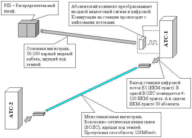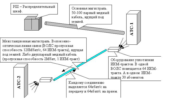 В Томске на механических АТС работают номера, начинающиеся на цифры: 21, 22, 23, 25, 77, 78. С одной стороны преимуществом является то, что, соединившиеся абоненты соединены физической двухпроводной линией. То есть рабочий диапазон такой линии от 300 Гц до 20 кГц, что теоретически позволяет при использовании широкополосных модемов получить скорости обмена до 2 Мбит, а в редких случаях и больше. Но такие оптимистические цифры в реальных соединениях невозможны из-за нескольких факторов: Качество коммутационных контактов на АТС очень низкое. Очень высокий “шум станции”. Сильные перекрестные помехи в кабельных магистралях (50-100 парный кабель с малым количеством витков на метр). Подверженность кабельных магистралей многим природным факторам и электромагнитным помехам (многие встречались с тем, что кабель, подходящий к вашему дому или офису, либо “замокает” при дожде, либо прослушивается сторонний разговор). Несколько лет назад в Томске эта проблема [3] была частично решена ЦСП (Цех Систем Передачи), введением развитой сети ИКМ – трактов (Импульсно-кодовая модуляция). На схеме №2 схематично показаны отличия многопарных кабельных магистралей и ИКМ – трактов: