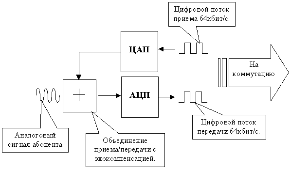 Механические АТС коммутируют аналоговые линии контактными площадками, управляемыми электромагнитным приводом, в то время как электронные коммутируют пространственно-временными манипуляциями цифровых потоков. Как видно из рисунка аналоговый сигнал от абонента приходит в абонентский комплект, где объединяется с входным потоком и после эхокомпенсации преобразуется с помощью АЦП в цифровой поток 64 кбит/с. Входной поток аналогично преобразовывается и поступает абоненту (см. рис.).