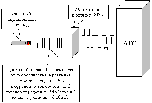 По определению ISDN – это сеть, обеспечивающая полностью цифровые соединения между оконечными устройствами (телефонами, факсами, модемами) для поддержки широкого спектра речевых и информационных услуг, доступ к которым осуществляет с помощью ограниченного набора стандартизированных многофункциональных интерфейсов. То есть упрощенно можно сказать, что это одновременное решение проблемы “последней мили”, ведь скорость 144 кбит/с в 4 раза больше чем 33,6 кбит/с, и проблемы потерь на АЦП/ЦАП, за счет перехода абонента на цифровой сигнал (см. рис.). Как видно из рисунка, к абоненту идет два канала приема/передачи данных, их еще называют B-каналами. Это дает возможность одновременно проводить два сеанса связи (например, передача данных и телефонный разговор). Основные услуги, предоставляемые сетью ISDN: Передача информации 3.1 кГц звук. Передача цифровой информации без ограничений. Пакетный режим передачи информации. Телесервис Телефакс Телефония среднего качества (3,1 кГц) Телефония высокого качества (7 кГц) Телетекст Телетекст со скоростью 64кбит/с Видеотекс (удаленный терминал, On-Line служб) Видеотелефония Важным моментом является то, что для перехода с обычной линии не нужно менять абонентскую проводку. Необходимо только переключить линия на абонентский комплект ISDN. А абоненту поменять свое аналоговое оборудование на ISDN оборудование. Заключение Всего несколько лет назад для организации глобальных сетей, было необходимо либо использование малоскоростных модемных соединений до 14400 бит/с, либо выделение значительных средств для организации собственных кабельных систем. И операторы связи не проявляли инициативы по организации сетей передачи данных. А желание абонента использовать коммутируемую линию как среду передачи данных, требовало регистрации, с увеличением абонентской платы. Многие просто скрывали, что используют свою телефонную линию с модемом, но бывали случаи, когда с милицией и понятыми таких “злоумышленников” отключали. В наши дни, когда естественный процесс перевода межстанционных магистралей на цифровые каналы захлестнул почти все регионы России, некоторые абоненты были недовольны тем, что его законную линию “уплотняют”, полагая, что это отрицательно сказывается на скоростях соединения. Но с появлением электронных станций, качество коммутации улучшилось, и на рынке появились модемы с реальной скоростью 33,6 кбит/с и больше, ситуация улучшилась. Это было предпосылкой к более активному использованию ТСОП для передачи данных. Позже появились решения по передачи данных через выделенные медный линии, которые позволяли организовывать каналы со скоростями более 2Мбит/с, ставшими на сегодняшний день очень популярными. Но это пересекается с развитием электронных АТС и ввода ИКМ-трактов в ВОЛС, что экономически более выгодно, и дает возможность предоставлять более качественную голосовую связь. Необходимо было заполнить нишу спроса на высокоскоростные каналы передачи данных. Решение уже было готово у зарубежных коллег, одно из них, это организация сетей передачи данных общего пользования (СПДОП), в России это направление развивалось вяло, ввиду экономического положения страны и огромных расстояний. Другое направление это окончательный переход на универсальные цифровые технологии с интеграцией услуг, такие как ISDN, AT