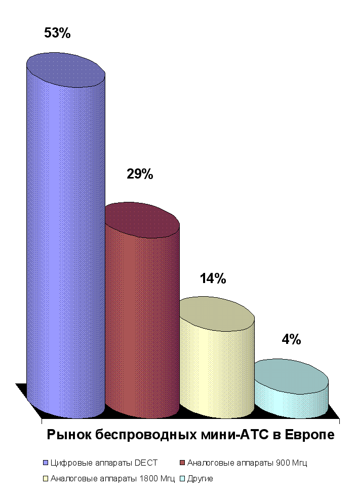 Аналоговая GSM модель предназначен для снижения затрат на услуги связи при соединении абонентов фиксированных и мобильных GSM (900/1800) сетей и служит - в зависимости от модели - основой для широкого спектра вариантов применения. ECOTEL GSM предоставляет различные возможности: от использования без доступа к фиксированной телефонной сети до соединений через АТС. В любом из случаев ECOTEL GSM предлагает наиболее экономичное соединение телефона или факса к GSM сетям. ECOTEL GSM с модулем TC 35 подключается к мини АТС или аналоговой телефонной линии и мобильной сети GSM 900/1800. Базовая модель этой серии - ECOTEL GSM3. Версии ECOTEL GSM3 L и ECOTEL GSM3 P- модели без голосовых сообщений и только для одного подключения к линии (L) или к телефону (P). Системы беспроводной связи, использующие частоту 1800 МГц, представляют собой базовый блок и радиотрубки (1 - 8 штук). В этом стандарте реализована не только возможность выхода на городскую линию с каждой трубки и пересылка вызова с трубки на трубку, но и полноценная телефонная связь между трубками, не занимая городскую линию. Таким образом, этот стандарт позволяет организовывать эффективные локальные сети радиосвязи с радиусом действия 100-200 метров. Вместе с тем, следует отметить, что системы внутриучрежденческой связи основанные на стандарте GSM не получили широкого распространения ввиду высокой стоимости необходимого для их развертывания оборудования. Доля аналоговых устройств на рынке беспроводных мини-АТС также быстро сокращается. Устаревшие аналоговые телефоны вытесняет цифровой стандарт DECT (Digital Enhanced Cordless Telecommunications). В настоящее время доля DECT-телефонов составляет 53% (рис. 3, стр. 14) в секторе беспроводных телефонов в Европе, а в Германии эта цифра уже превысила 80% [37].