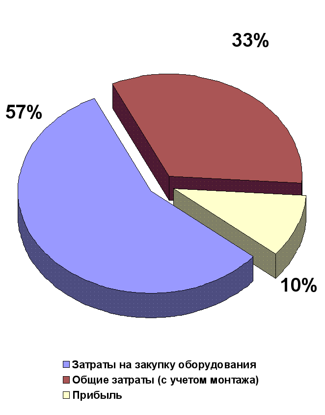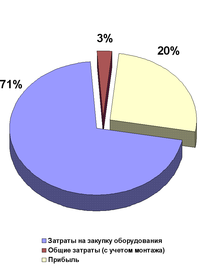 бухгалтерией предприятия были рассчитаны общие затратына монтажные работы в сумме 17 тысяч 406 рублей, 70 коп. Всего предприятием на реализацию проекта затрачено: 33 444,57 + 1 888,65 + 17 406,70 = 52 739,92 рублей Исходя из общей цены контракта в 69 тысяч 667 рублей,11 коп. (одобренной заказчиком) рассчитаем полученную ООО «Сибирь-связь» прибыль. Вычтем из стоимости контракта НДС используя формулу (3.1): 69 667,11 / 1,18 = 59 039,92 рубля Соответственно, выручка полученная предприятием составила 59 тысяч 39 рублей, 92 коп. Определим прибыль полученную ООО «Сибирь-связь» по формуле (3.2): 59 039,92 - 52 739,92 = 6 300 рублей Прибыль предприятия составила 6 тысяч 300 рублей. Чистая прибыль после уплаты налогов составила (3.3): 6 300 – (24%) = 4 788 (4 тысячи 788 рублей) Вывод: в результате реализации проекта по монтажу аналоговой мини-АТС общей стоимостью в 69 тысяч 667 рублей, 11 коп., чистая прибыль ООО «Сибирь-связь» составила 4 тысячи 788 рублей. В целях наглядности представим в виде диаграммы (рис. 6, стр. 62) данные по процентному соотношению затрат на оборудование, проведенные монтажные работы, прибыли и налоговых отчислений в общей стоимости реализованного проекта (без учета НДС). Вышеперечисленные данные будут в дальнейшем использованы как экономическая основа для анализа прибыльности аналогичного проекта при использовании оборудования беспроводной связи фирмы «Eline».