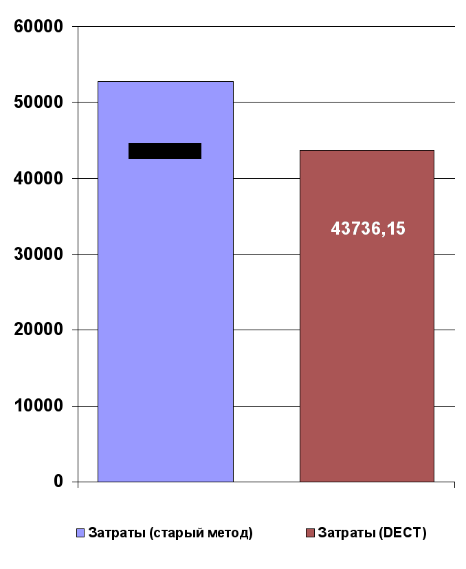 Общая стоимость необходимого для телефонизации офиса оборудования составила 41 тысячу 847 рублей, 50 коп. В итоге, предприятием на реализацию проекта затрачено: 41 847,50 + 1 888,65 = 43 736,15 рублей Общие затраты на возможную реализацию учрежденческой сети связи состоящей из 16 абонентов посредством использования оборудования стандарта DECT производства фирмы «Eline» составили 43 тысячи 736 рублей,15 коп. Сравним на рисунке 7 полученные данные с затратами на реализацию аналогичного проекта спроектированного на основе ранее применяемой АТС. В результате использования такого оборудования затраты предприятия составляют 52 тысячи 739 рублей, 92 коп.
