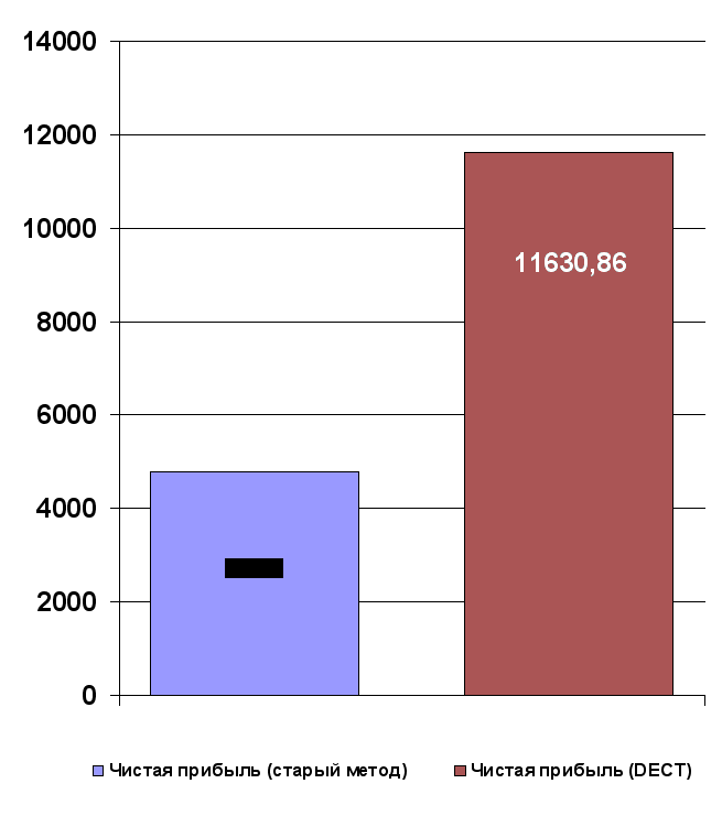 В результате реализации проекта по монтажу аналоговой мини-АТС общей стоимостью в 69 тысяч 667 рублей, 11 коп., чистая прибыль ООО «Сибирь-связь» составила всего 4 тысячи 788 рублей. Вместе с тем, использование для реализации проекта беспроводной автоматической телефонной станции и оборудования фирмы «Eline» позволяет получить значительно больший доход. Согласно данным проведенного экономического анализа в результате реализации аналогичного контракта на новом оборудовании прибыль предприятия может вырасти более чем в два раза (рис. 9).
