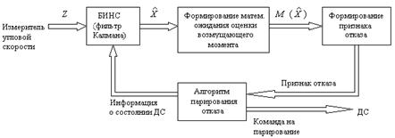 j=x, y, z. Работа алгоритма основана на анализе величины оцениваемого в фильтре Калмана возмущающего момента. Если математическое ожидание оценки возмущающего момента, вычисленного на некоторой временной базе, где управление равно нулю, превосходит допустимый порог, то принимается решение об отказе ДС и переходе на резерв (рис. 1).