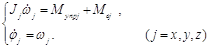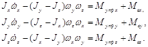 Здесь wj – проекции вектора абсолютной угловой скорости тела на оси ССК; Мупрj, Мвj - управляющий и возмущающий моменты соответственно; Jj - главные центральные моменты инерции тела относительно связанных осей; j=x, y, z. Наряду с динамическими уравнениями рассматриваются