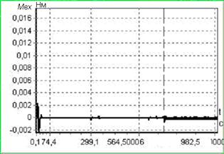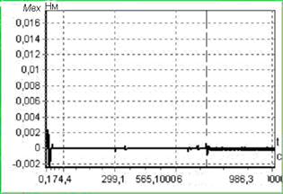 Рис. 3 Выявление не отключения ДС с остаточной тягой 50% На рисунках вертикальной пунктирной линией выделен момент отказа ДС. Как показали результаты моделирования, понижение неполной тяги при отказе ДС приводит к увеличению времени идентификации отказов. Так при полном не отключении ДС (тяга 100%) это время равно 701.3 с, а при неполном не отключении время идентификации отказа составило 704.3 с и 707.1 с для остаточной тяги в 50% и 15% соответственно. Моделирование показало также, что существенное повышение уровня шумов измерений не приводит к значительному снижению чувствительности системы к выявлению отказов типа "неотключение" с малой остаточной тягой. Таким образом, предложенный на основе фильтра Калмана алгоритм позволяет идентифицировать отказы двигателей стабилизации КА, в том числе, отказы с малой остаточной тягой (около 15%) при наличии шумов измерений и действии возмущающих моментов. Список литературы: 1. Алексеев К.Б., Бебенин Г.Г. Управление космическими летательными аппаратами. - М.: Машиностроение, 1974. - 340 с. 2. А.С. № 269708 СССР, МКИ2 B64G 1/20. Спецсистема / О.Н.Калиберда, В.Д.Кожухов, Н.А.Коршунов, Г.В.Беляев. Заявка № 3167800 от 08.04.87 г. 3. Браммер Л., Зифлинг Г. Фильтр Калмана-Бьюси. - М.: Наука, 1982. 4. Раушенбах Б.В., Токарь Е.Н. Управление ориентацией космических аппаратов. - М.: Наука, 1974. - 600 с. Поступила в редколлегию 26.04.04 |