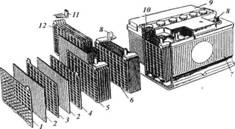Рис. 1. Устройство аккумуляторной батареи 1 – решетка; 2 – сепаратор; 3,4 – электроды соответственно положительный и отрицательный; 5 – полублок отрицательных электродов; 6 – блок электродов с сепараторами; 7 –корпус моноблока; 8 – полюсный вывод; 9 – общая крышка; 10 – пробка; 11 – мостик с борном; 12 – полублок положительных электродов 1. Электрохимические реакции в аккумуляторе, электродвижущая сила, напряжение и внутреннее сопротивление 1.1 Действие электролита в аккумуляторе Принцип действия кислотно-свинцового аккумулятора заключается в поляризации электродов. Электроды (сернокислый свинец PbS04), погруженные в электролит (водный раствор серной кислоты), под действием электрического тока вступают в химическую реакцию. При зарядке батарея включается параллельно в цепь источника постоянного тока, напряжение которого выше э. д. с. батареи. В процессе зарядки активная масса отрицательных пластин постепенно превращается из сернокислого свинца PbS04 в губчатый свинец РЬ, а активная масса положительных пластин — в перекись свинца РЬ02, при этом удельный вес электролита повышается до 1,24—1,31 (вместо 1,12—1,19 у разряженного аккумулятора). Такое повышение удельного веса электролита объясняется тем, что во время зарядки отрицательные ионы кислотного остатка S04 соединяются с положительными ионами водорода Н2 и дают серную кислоту H2S04, которая выделяется в электролит. Следовательно, изменения плотности электролита аккумуляторной батареи, происходящие при зарядке или разрядке, позволяют судить о ее состоянии. При разрядке железо-никелевого аккумулятора гидрат окиси никеля Ni(OH)3 активной массы положительных пластин переходит в гидрат закиси никеля Ni(OH)2. Железо активной массы отрицательных пластин переходит в его окись Fe(OH)2. В процессе зарядки аккумулятора происходят обратные процессы у положительных и отрицательных пластин. При разрядке и зарядке железо-никелевой аккумуляторной батареи удельный вес электролита не изменяется. Э. д. с. железо-никелевой батареи определяется в основном химическим состоянием активной массы пластин и почти не зависит от плотности электролита. 1.2 Электродвижущая сила Электродвижущей силой (ЭДС) аккумулятора Е называют разность его электродных потенциалов, измеренную при разомкнутой внешней цепи. ЭДС батареи, состоящей из n последовательно соединенных аккумуляторов. Следует различать равновесную ЭДС аккумулятора и неравновесную ЭДС аккумулятора в течение времени от размыкания цепи до установления равновесного состояния (период протекания переходного процесса). ЭДС измеряют высокоомным вольтметром (внутреннее сопротивление не менее 300 Ом/В). Для этого вольтметр присоединяют к выводам аккумулятора или батареи. При этом через аккумулятор (батарею) не должен протекать зарядный или разрядный ток. Равновесная ЭДС свинцового аккумулятора, как и любого химического источника тока, зависит от химических и физических свойств веществ, принимающих участие в токообразующем процессе, и совершенно не зависит от размеров и формы электродов, а также от количества активных масс и электролита. Вместе с тем в свинцовом аккумуляторе электролит принимает непосредственное участие в токообразующем процессе на аккумуляторных электродах и изменяет свою плотность в зависимости от степени заряженности аккумуляторов. По