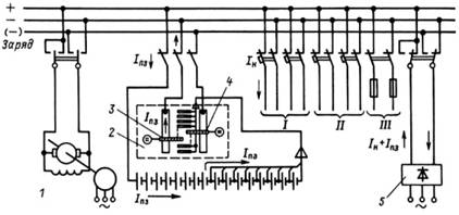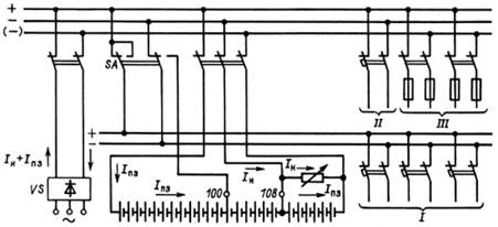 Рис. 2.1. Схема аккумуляторной установки с элементным коммутатором: I - цепи управления; II - аварийное освещение; III - силовые цепи (электромагниты включения); IН - ток нагрузки; IПЗ - ток подзаряда
