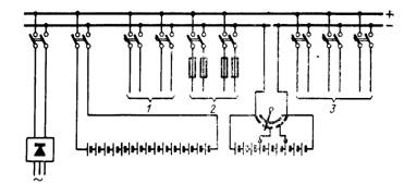 Рис. 2.2. Схема аккумуляторной установки без элементного коммутатора, работающей в режиме постоянного подзаряда: I, II, III, IПЗ - то же, что на рис. 2.1. Для формирования пластин и глубоких перезарядов предусматривают передвижной двигатель-генератор, который при необходимости доставляют на подстанцию. Схема распределения оперативного тока. От шин постоянного тока отходят цепи, питающие группы электроприемников различного назначения. Цепи управления, сигнализации и аварийного освещения обычно защищаются автоматическими выключателями, цепи питания электромагнитов включения - предохранителями. При централизованном распределении оперативного тока для питания силовых цепей выключателей вблизи их приводов имеются шинки постоянного тока, соединенные между собой кабелями по кольцевой схеме (рис. 2.3). Для надежности питания кольцо секционируется при помощи установленных в шкафах секционных рубильников Р1-2, Р3-4 . Секции кольца питаются от шин постоянного тока отдельными линиями. 2.3 Схема с противоэлементами Противоэлеиментом называют электролитический прибор (элемент) с э.д.с., возникающей только при прохождении через него тока от постоянного источника и направленной навстречу току. Противоэлементы включают последовательно в цепь тока для уменьшения напряжения источника энергии. Наилучшими характеристиками обладают щелочные противоэлементы с пластинами из никелированного железа или нержавеющей стали в растворе едкого калия или натра. При прохождении через такой противоэлемент тока происходит реакция электролиза воды с выделением водорода на катоде и кислорода на аноде. Материал электродов в реакции не участвует. Напряжение противоелемента около 2 В. Оно мало изменяется с изменением тока, что отличает противоелемент от реостата. При работе противоэлементов выделяется некоторое количество тепла, которое ограничивает длительную нагрузку. Имеет место также потеря воды электролита вследствие электролиза в соответствии с количеством ампер-часов, протекающих через противоэлементы. Поэтому требуется переодическая доливка воды. Щелочные противоэлементы допускают замыкание накоротко, что облегчает регулирование напряжения. Они дешевы, долговечны, не боятся длительного бездействия и почти не требуют ухода. Щелочные противоэлементы получили применение на телеграфных и телефонных станциях для регулирования напряжения и получения нескольких ступеней напряжения при заданном источнике энергии. Они могут быть использованы также на станциях и подстанциях для регулирования напряжения на сборных шинах управления. Номинальный ток противлелементов должен соответствовать длительному току нормального режима установки, который обычно не превосходит нескольких десятков ампер. Поэтому размеры противоелементов невелики. Число противоэлементов зависит от числа аккумуляторов в батарее. Так, например, при 120 аккумуляторах необходимо иметь (120*2,35-230)/2=26 элементов. При нормальном режиме должны быть включены (120*2,15-230)/2=14 элементов. Остальные могут быть закорочены. При разряде батареи все противоэлементы должны быть закорочены. Достоинство схемы с противоэлементами заключается в том, что все аккумуляторы находятся в одинаковых условиях; это упрощает наблюдение и уход за ними. Напряжение у приемников всех видов не выходит за допуст